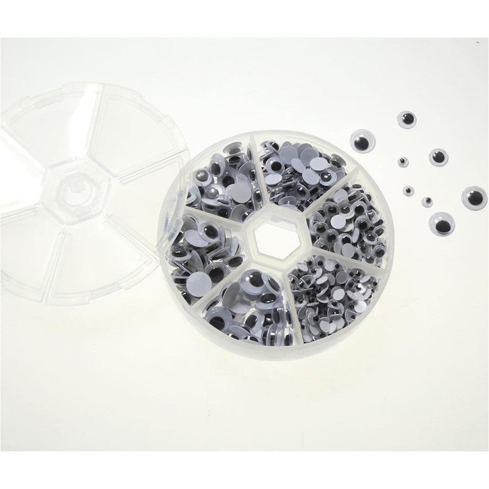 Cette boite ronde comprend 600 cabochons boutons en forme d’œil à coller de 6 dimensions différentes. Retrouvez ainsi des petits et grands yeux de 4 à 9 mm de diamètre, et de 2 à 3 mm d'épaisseur.Ce kit comprend : 240 boutons de 4 mm, 145 de 5 mm, 90 de 60 mm, 65 de 7 mm, 40 de 8 mm et 30 cabochons de 9 mm.