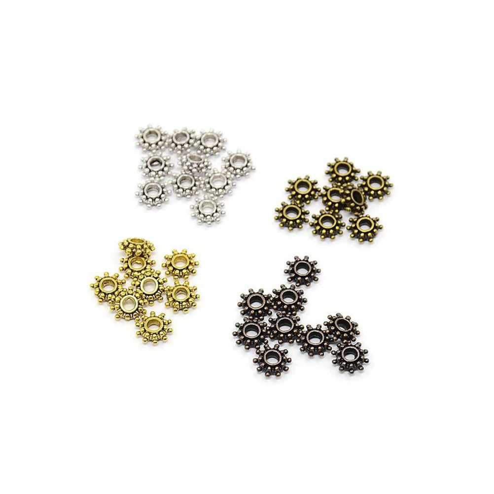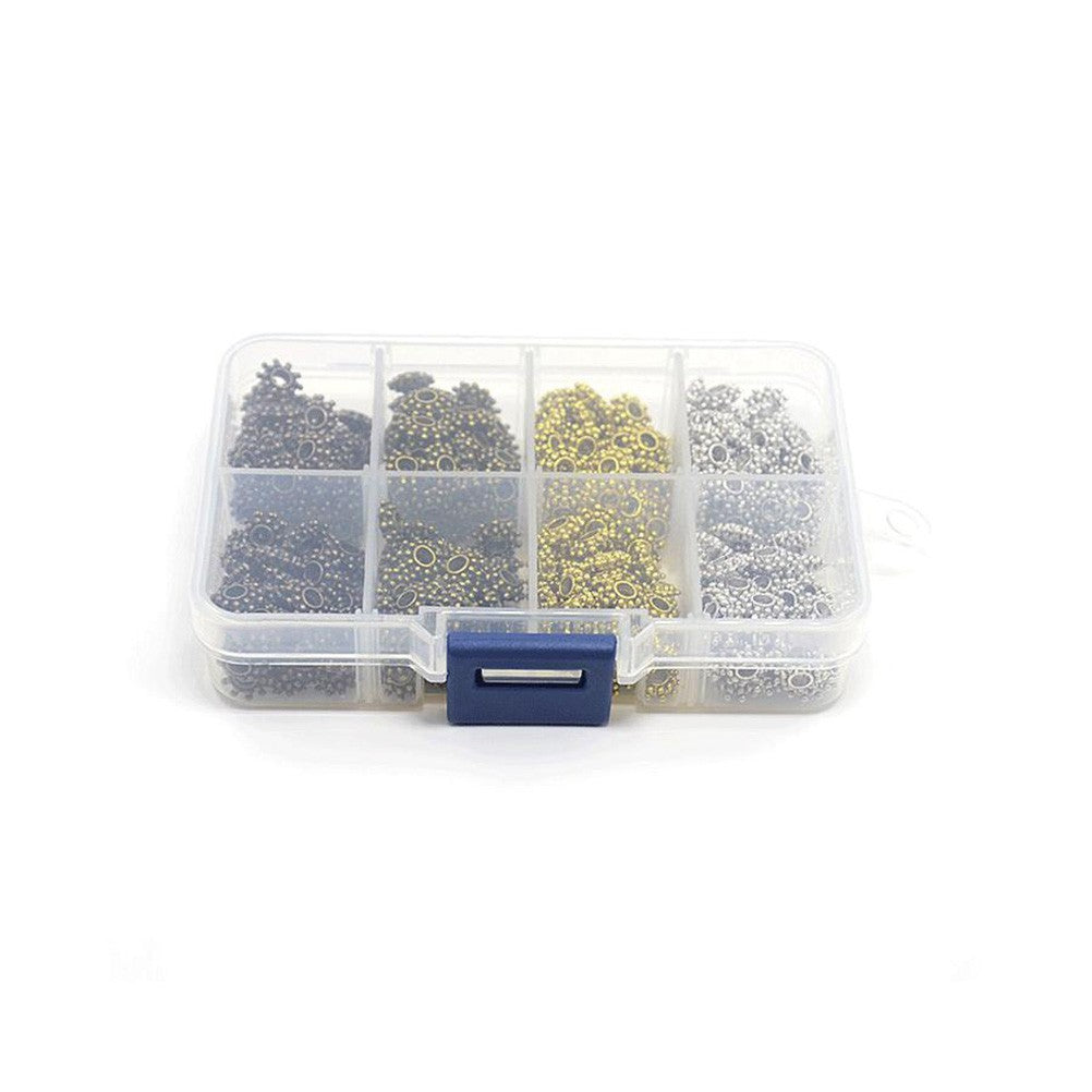 Ce kit comprend des perles fantaisie intercalaires en alliage et sans nickel de plusieurs couleurs (argenté, doré, bronze, anthracite), idéales pour des centaines de créations !Elles mesurent 8,5 x 3 mm avec un trou de 3 mm de diamètre. Vous disposerez de 100 pièces par couleur, le tout bien protégé dans sa boîte de rangement à 8 compartiments.Les perles fantaisie de ce kit onstitueront de belles intercalaires à placer entre des perles de couleurs plus grosses lors de la création de bracelets, colliers et boucles d'oreilles, grâce à leur jolie forme de fleur pissenlit. Le kit est idéal pour les créateurs et créatrices qui fabriquent des bijoux différents ou qui veulent les créer selon leur inspiration du moment !