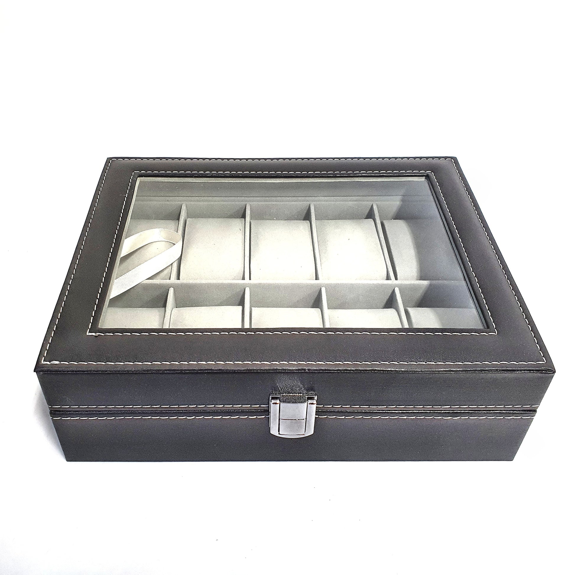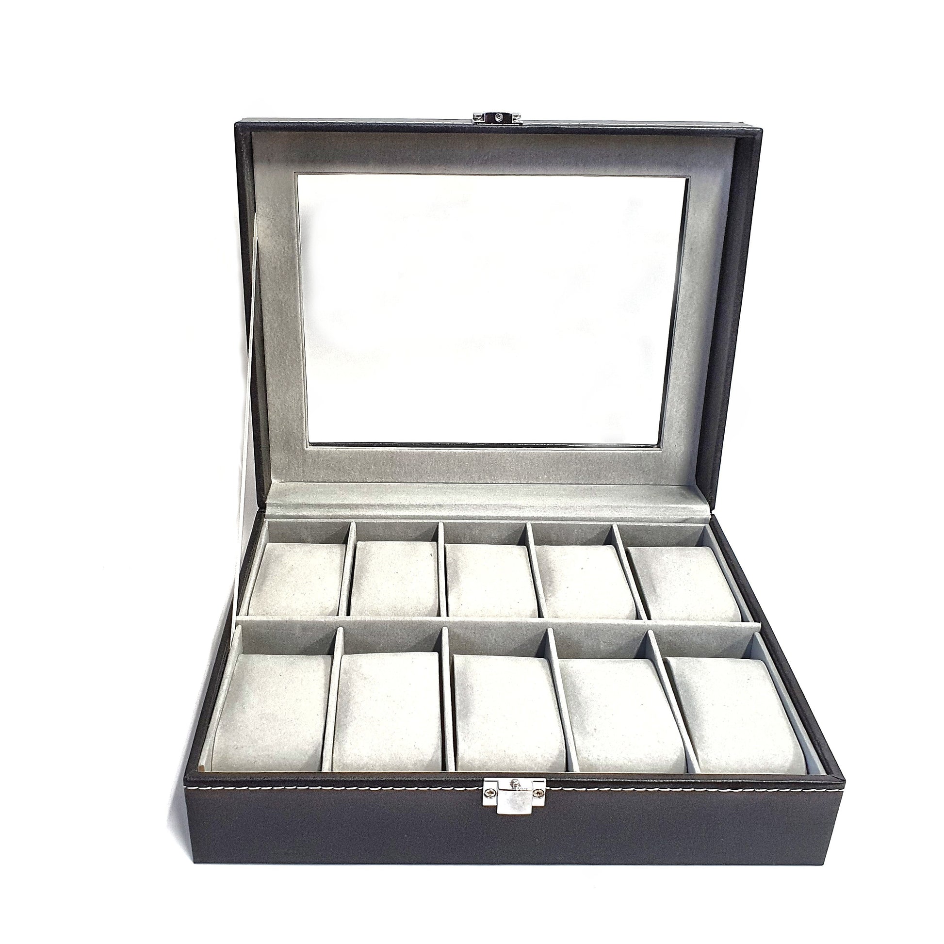 Coffret moderne de rangement pour 10 montres. Simili cuir noir, intérieur en velours des plus raffinés. Les montres sont posées sur des coussinets tout doux. Vue magnifique à travers la fenêtre du haut.