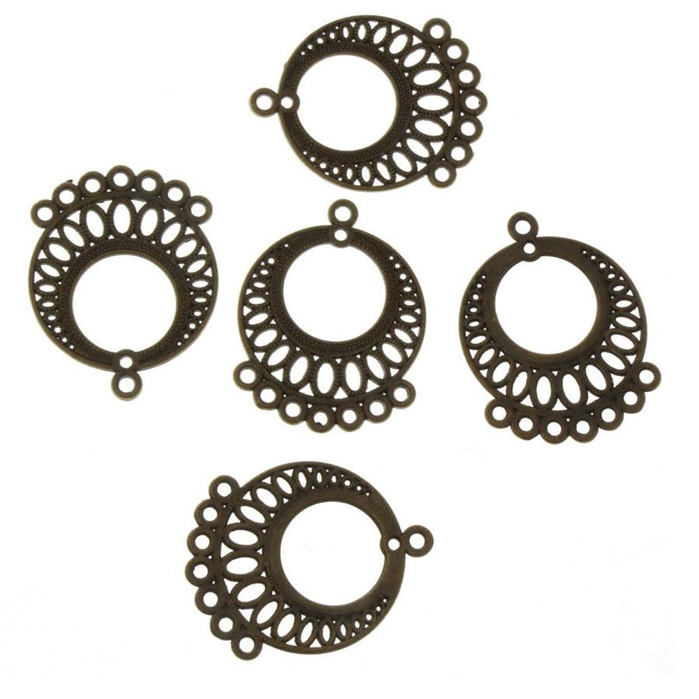 5 connecteurs couleur bronze, en formes exclusivement rondes et ovales. Grâce aux nombreux trous disponibles, vous pouvez utiliser l'apprêt de multiples manières et créer aussi bien des boucles d'oreilles que des colliers ou des bijoux de main ! Les trous ont un diamètre de 2,5 millimètres. Le connecteur mesure quant à lui 37 mm de longueur sur 29 mm de largeur. Enrichissez votre création avec des perles rondes ou fantaisie, des pierres précieuses, une breloque… Une grande variété d’apprêts peut être suspendue sur ces connecteurs !