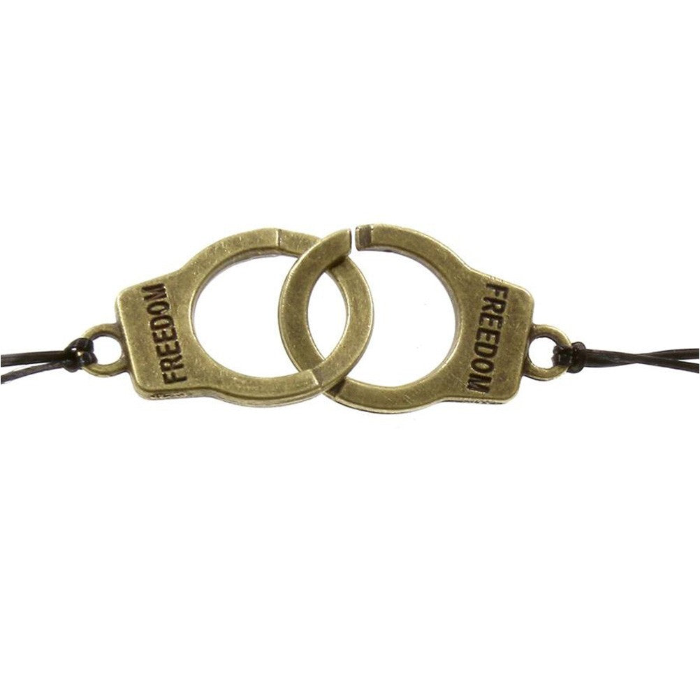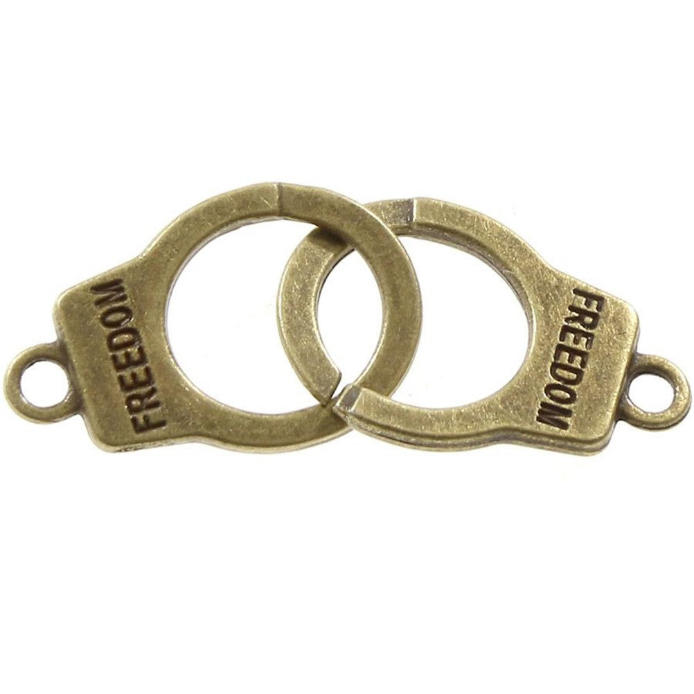Des connecteurs bracelets qui ferment (au sens propre et figuré du terme) parfaitement le bijou autour de votre poignet. La présentation en menottes est originale et la couleur bronze renforce le côté artisanal de l'objet. Une inscription « Freedom » est présente sur chaque menotte. Les dimensions du connecteur sont 4 centimètres pour la longueur et 1,5 centimètre pour la largeur. Bracelet fantaisie en tout genre, bijou thématique à l’esprit revendicatif, créez ce que vous souhaitez avec ces connecteurs bracelets !