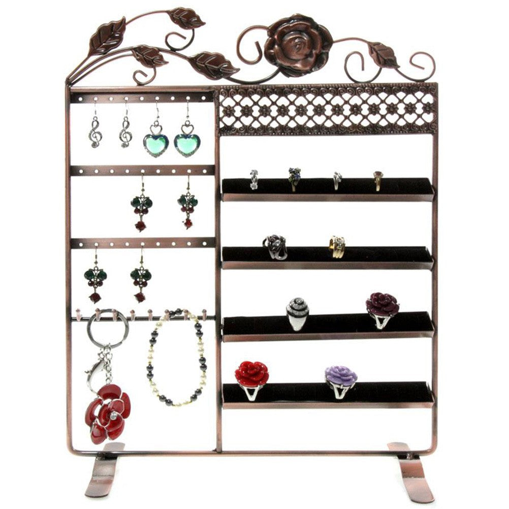 Ce cadre porte bijoux comporte une partie destinée à exposer des bagues et une seconde pour suspendre des boucles d’oreilles et bracelets. Les quatre rangées pour bagues contiennent 10 fentes chacune. Vous pouvez exposer jusqu’à 13 paires de boucles d’oreilles, avec une longueur maximale de 5,5 centimètres. Huit crochets complètent ce presentoir tout-en-un. Avec une hauteur de 38 cm et une largeur de 28,5 cm, vous pouvez facilement le disposer en boutique ou chez vous. Une jolie décoration florale assure la finition du cadre porte bijoux.