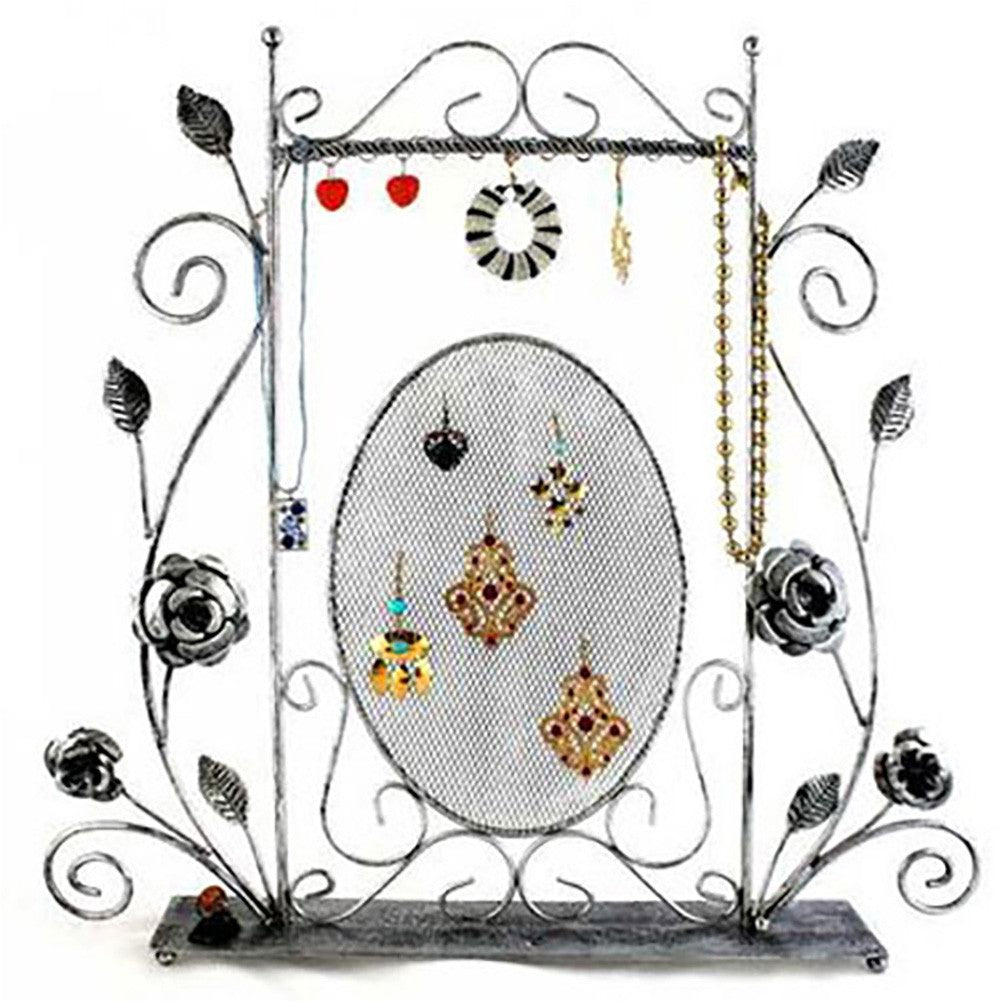 Ce presentoir bijoux mesure 47 centimètres de hauteur et 45 cm de longueur. Il peut accueillir des boucles d’oreilles, colliers et bracelets. Le cadre principal est richement décoré avec des motifs de fleurs, des petites feuilles et de multiples arabesques. La partie ovale est percée de nombreux trous spirales pour accrocher des boucles. Des crochets sont présents sur la partie supérieure du cadre porte bijoux. Le style original s'associe à un socle lourd pour une bonne stabilité. En noir ou en gris, personnalisez votre presentoir bijoux !