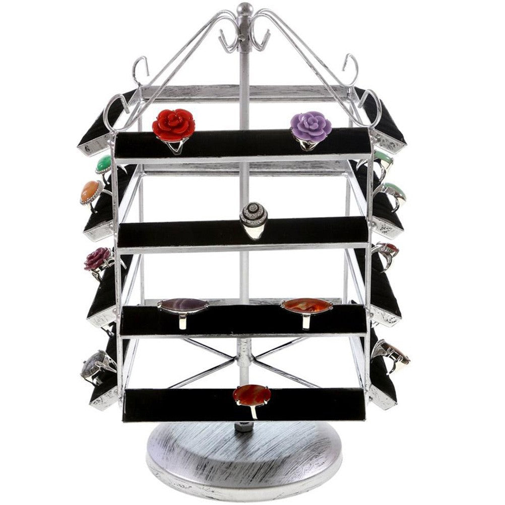 Ce presentoir bague mesure 37 centimètres de hauteur et 21 cm de largeur. Il se présente sous la forme d’un manège carré muni de 4 étages. Chaque rangée dispose de 10 fentes, vous pouvez donc déposer jusqu’à 160 pièces sur ce modèle ! Trois couleurs sont proposées : noir, cuivre et gris patiné. Les supports pour bagues sont recouverts de velours. De plus, le sommet en tourniquet bijoux permet de faire pivoter l’ensemble des rangées ! Rangez et exposez vos créations sur ce presentoir bague.