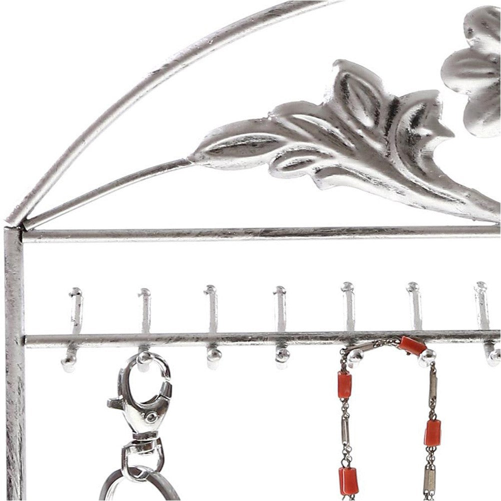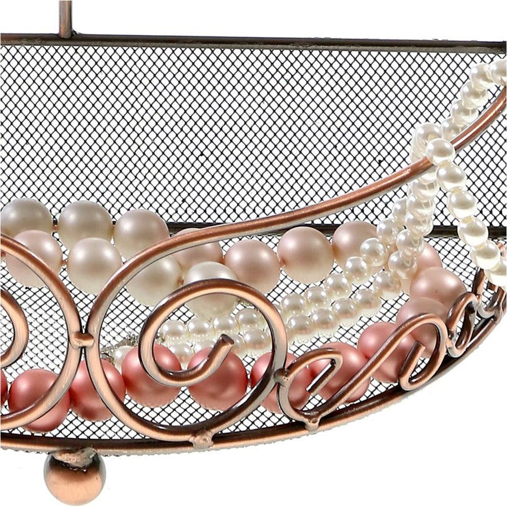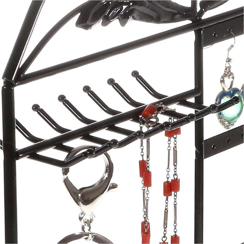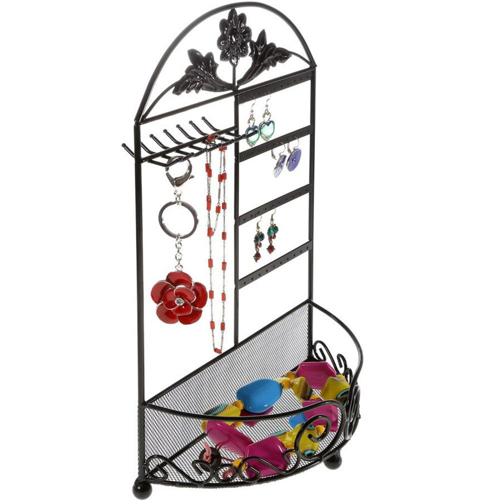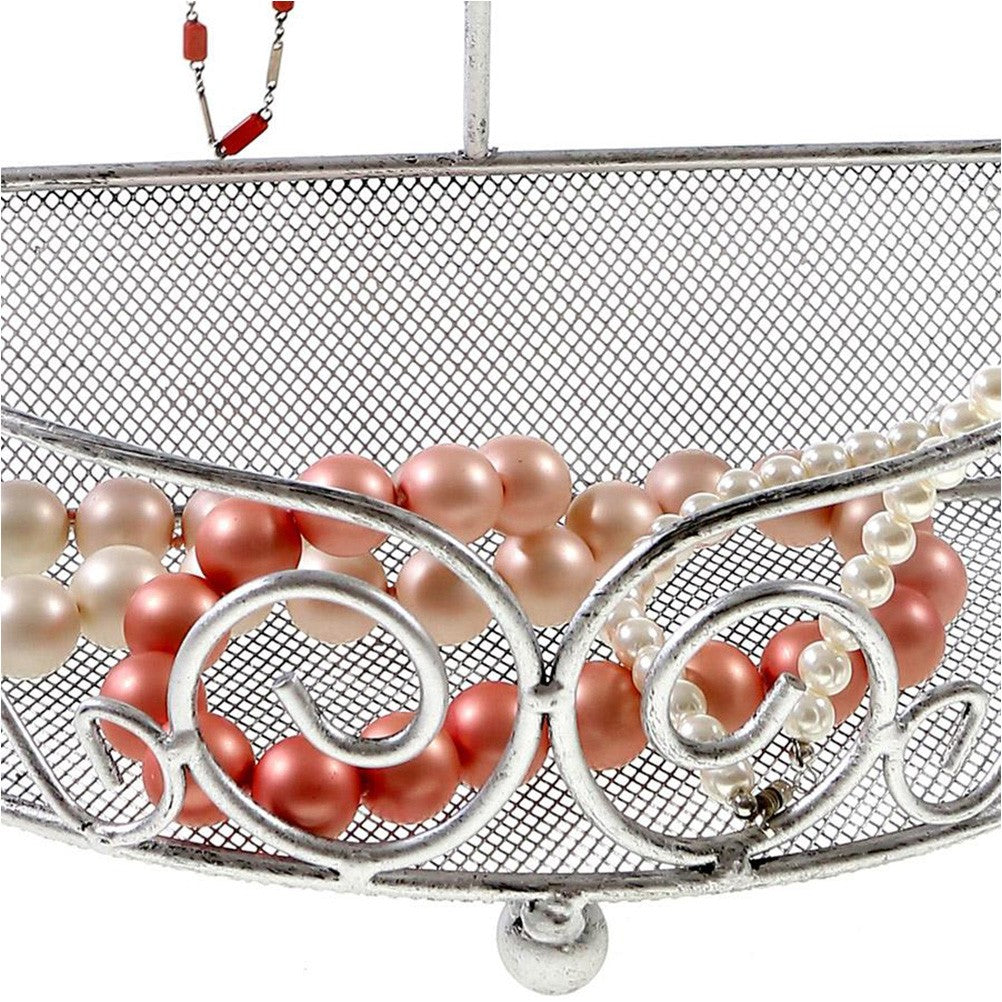 Le porte bijoux comporte trois parties distinctes, afin de présenter de nombreuses parures. 14 crochets sont là pour présenter bracelets et accessoires de type porte clé, et 20 paires de boucles d’oreilles peuvent être suspendues à côté sur les 4 rangées horizontales. Le socle en forme de corbeille vous permet en outre de déposer un collier ou des accessoires bijoux à l’intérieur. Ce presentoir bijoux mesure 40,8 centimètres de hauteur et 26,8 cm de large. Il existe en plusieurs couleurs. Faites votre choix et laissez-vous séduire par le joli design du porte bijoux !